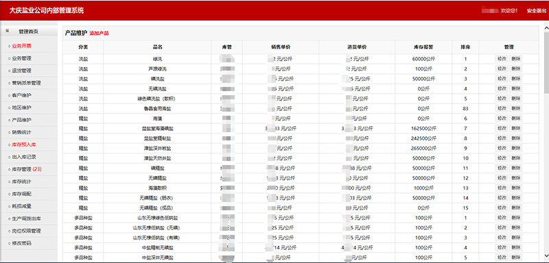 大慶鹽業(yè)公司進(jìn)銷(xiāo)存管理系統實(shí)現前臺開(kāi)票、退貨、營(yíng)銷(xiāo)派單、客戶(hù)檔案、銷(xiāo)售統計、商品入庫、出入庫記錄、庫存管理、庫存統計、庫存調配、生產(chǎn)調撥、權限分配等功能需求。